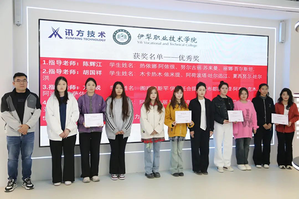 由沙红梅、闫小强老师指导的玛伊热·柯尤木、丁慧茹、李冰团队凭借出色表现取得金奖。伊犁职业技术学院教务处处长陈辉江处长为他们颁奖,现场响起热烈掌声。