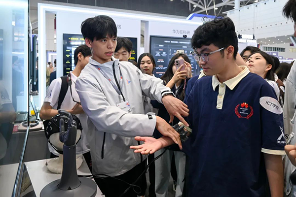 随后,研学团来到华为脑机接口专区,探索华为脑机接口独角兽用意念控制未来的奥秘。华为最新公布的脑机接口芯片专利,展现出其在信号处理、闭环反馈等核心技术上的领先优势。何柏雨同学体验了华为脑机接口设备的演示,对只需“想一想”就能操控设备完成指令的神奇功能惊叹不已。他感慨道:“这次大会让我深刻认识到,脑机接口技术不仅是科技领域的重大突破,更是人类与机器融合的新开端。”